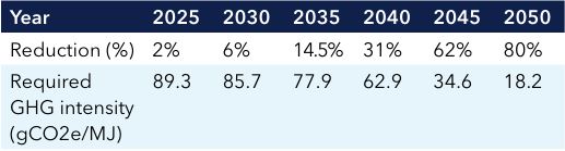 The GHG intensity requirements are set as a percentage reduction relative to a 2020 reference value of 91.16 gCO2e/MJ. The percentage reduction requirement increases gradually every five years to 2050 – meaning, for example, that it stays at 2% from 2025 to end-2029:
