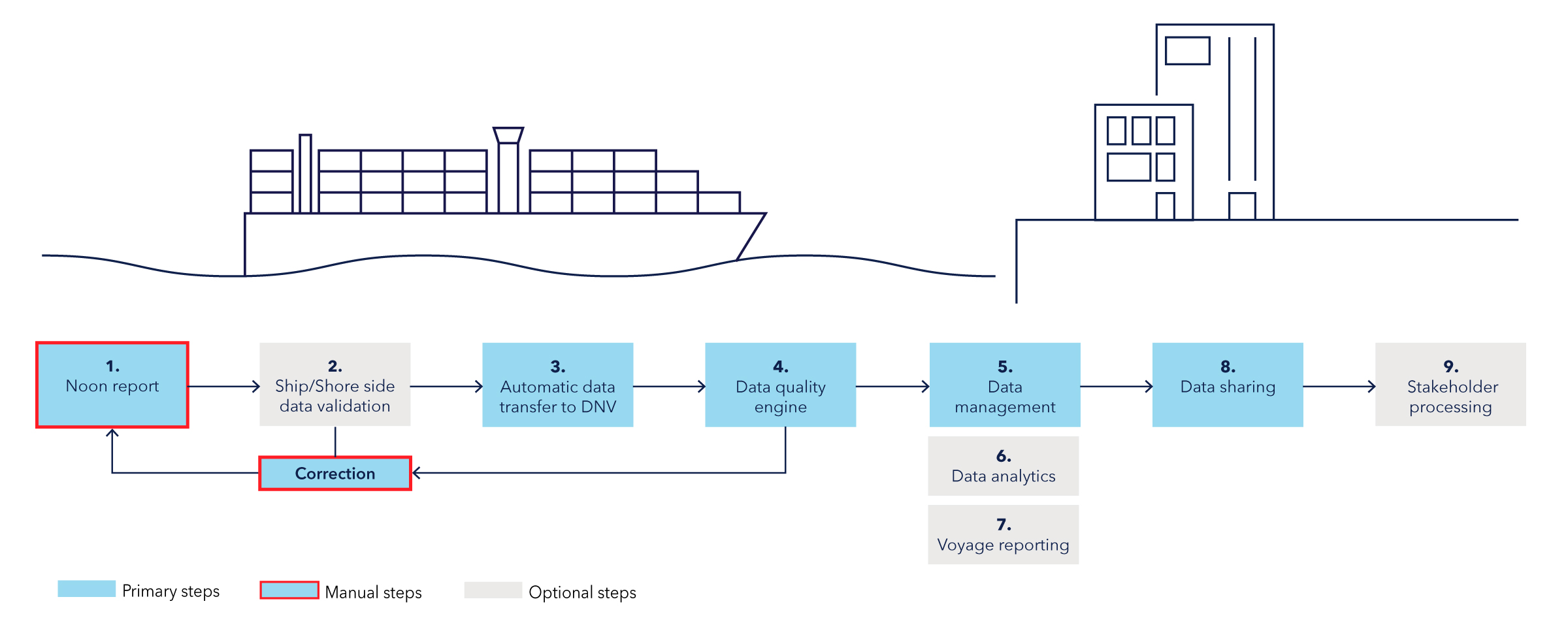 High-quality input is key to accurate emissions reporting. Noon reports, filled in by onboard crew, start the process and therefore significantly influence the efficiency and quality of the process. The reported data is verified and checked for missing data and plausibility, such as matching voyage times with miles sailed. Shipping companies must correct any relevant issues found in the process to meet quality standards, ensuring reliable data for compliance and correct EU allowance settlement.